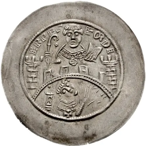 | Descripción del anverso | Facing half-length figure of St. Martin behind arcade with towers at each end, holding crozier in right hand and bible in left; below, facing half-length figure of the archbishop, raising hands in prayer; to right. |