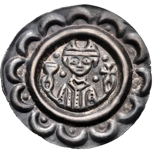 | توضیحات روی سکه | Half-length figure facing, wearing mitra, holding chalice and cross; pair of pellets flanking head; all within border of pellets-in-arches. |