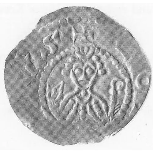 Popis líce Bust facing, holding crozier in left hand and book in right.