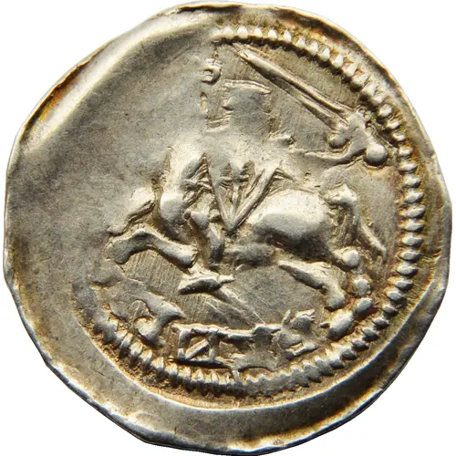 | Descrição do anverso | Horseman galloping to the left holding a sword with his right hand and covering himself with a shield with the Luxembourg lion on his left hand. The legend is written upside down and begins near the horse`s hind legs. The S, separated from the rest of the legend, lies near the head of the horse. The whole is surrounded by an outer ring of pearls. |