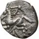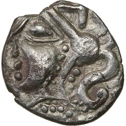 正面描述 Head facing left, with crested and plumed helmet with raised visor; granulated.