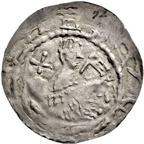 | Popis líce | Helmeted half figure with helmet standing on a building, holding a flag. To the left a cross. |