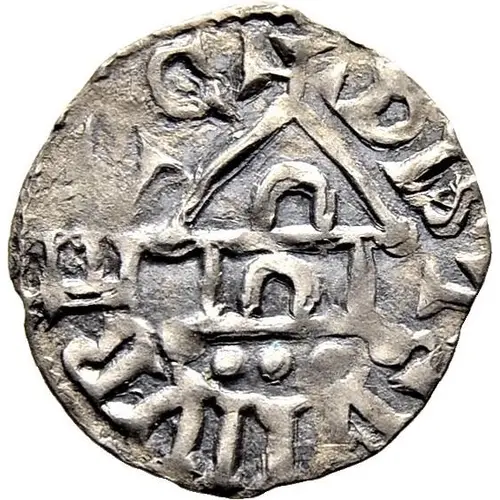 Descrizione del dritto Cross above temple with arched door and window, three dots below.