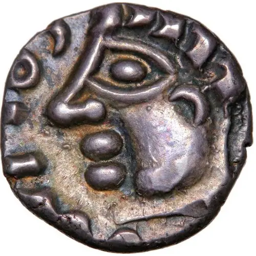 | Opis awersu | Head left with large eye, hair in parallel wavy locks; caption in front of the face; beaded circle. |