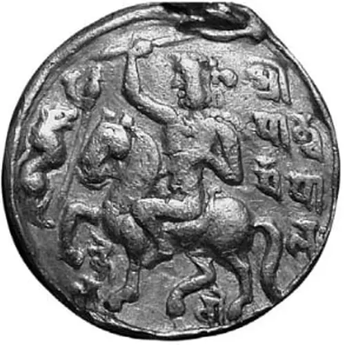 | Obverse description | King ? riding on horseback left, with right hand holding up a spear, aimed at animal (lion or boar ?) at left, standard before the king. Four line Brāhmi legend at right: Sri / mā ndha / rma pā / lah, below horse’s forelegs, in two lines: kai / la, below horse’s hind legs: vo |