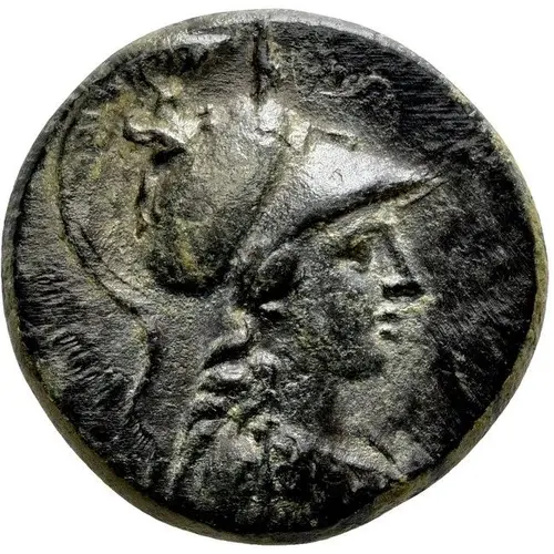 Mô tả mặt trước Helmeted head of Athena, right.