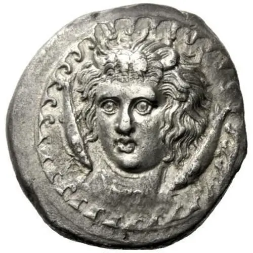 | Descrizione del dritto | Bust of young river-god Hipparis, facing three-quarters left, with horns on forehead and hair in long loose curls; a fish downwards on either side. On neck, signature EYAI. The whole within border of stylised waves. |