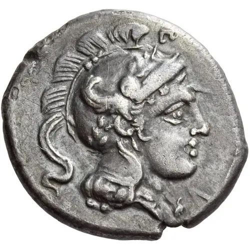 | Popis líce | Head of Athena facing right, wearing a crested Attic helmet decorated with a wreath and wing, above visor, Π and below, Φ |