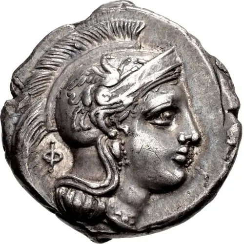 | Obverse description | Head of Athena right, wearing crested Attic helmet decorated on the bowl with chariot or griffin, sometimes griffin on the neck guard, ΦΙΛΙΣ or ΤΙΩΝΟΣ or Φ behind neck. |