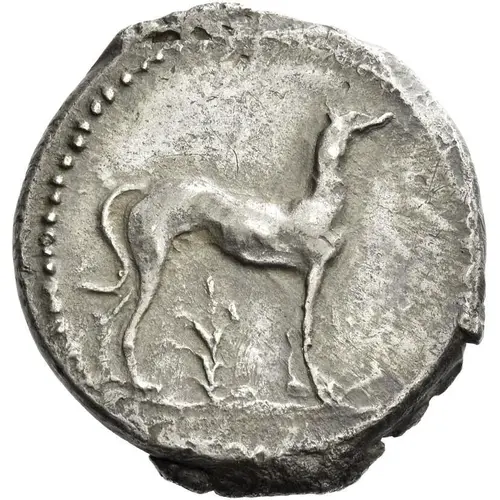 | Obverse description | Hunting dog standing right; below, branch. |