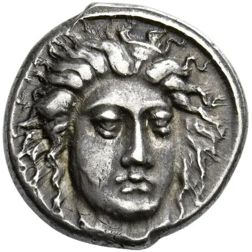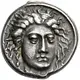 | Reversbeschreibung | Man-headed bull standing left, dolphin left in exergue. |