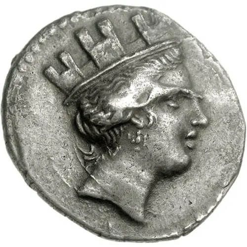 | Opis awersu | Head of Tyche facing right, wearing turreted headdress, triple-pendant earring and a necklace. |