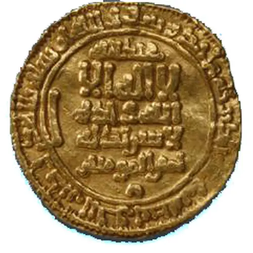 | 裏面の銘文 | al-imam / muhammad / rasul / allah / al-mahdi billah bism allah duriba hadha’l-dinar bi’l-qayrawan sana khams wa thalathmi’a (Translation: Field: “the Imam, Muhammad is the messenger of God, al-Mahdi billah” Margin: “in the name of God, this dinar was struck in al-Qayrawan the year five and three hundred”) |
