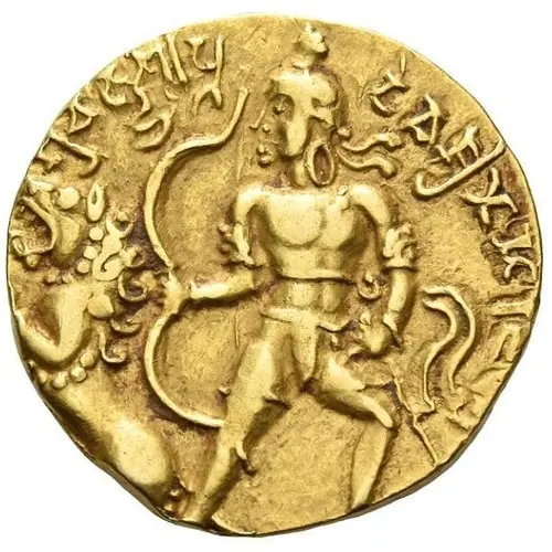 | Description du revers | Crowned and Nimbate Goddess Lakshmi (Goddess of prosperity in material and spiritual matters) with lion with lotus in hand, looking left with lettering. |