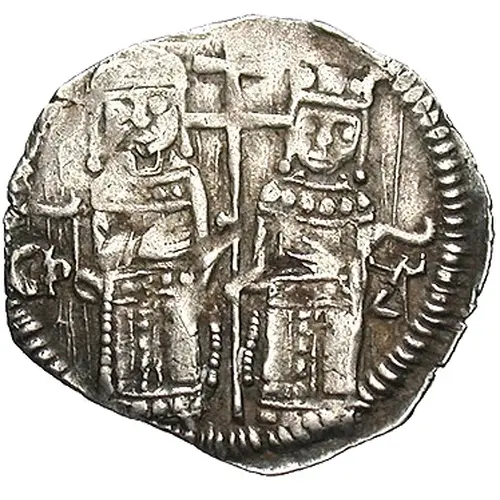 | Mô tả mặt trước | Imperial couple Dusan and Jelena standing, holding jointly patriarchal double cross, and cross-tipped scepter each, Serbian legend |