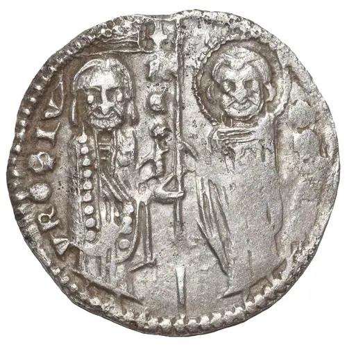 | Beschrijving voorzijde | Stefan II standing facing on left, holding akakia in his left hand and St. Stefan, nimbate, standing facing on right, holding book of Gospels in his left hand; both holding, between them with their right hands, long banner. |