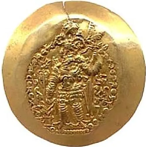 | Obverse description | King standing left making offering at a fire altar, wearing two-horned headdress with artichoke finial, and holding a trident |