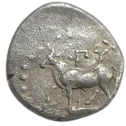 | توضیحات روی سکه | Bull standing left on dolphin left; monogram above bull, all in border of dots. |