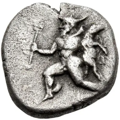 | 表面の説明 | Hermes, bearded and nude except for his petasos and cloak over his shoulders, running to left with winged feet, holding kerykeion in his extended right hand and holding a ram in the crook of his left arm. |