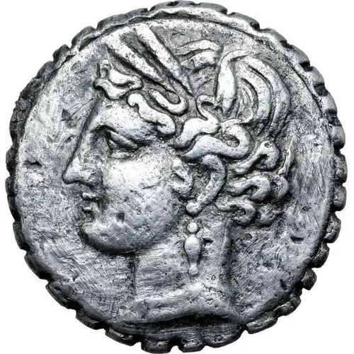Mô tả mặt trước Head of Tanit left, wreathed with corn, wearing necklace and single-drop ear-ring.