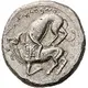 | Opis awersu | Galley, with an eyed prow ending in a ram and a lion’s head figure head, and with three armored Greek hoplites standing left on deck, moving to left above waves. Below, Phoenician letters ’z above a hippocamp swiming to left with a murex shell below. |