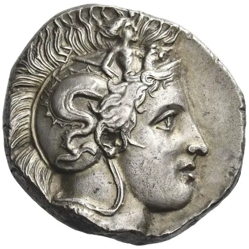 | Obverse description | Head of Athena right, wearing crested Attic helmet decorated with Scylla holding trident. |