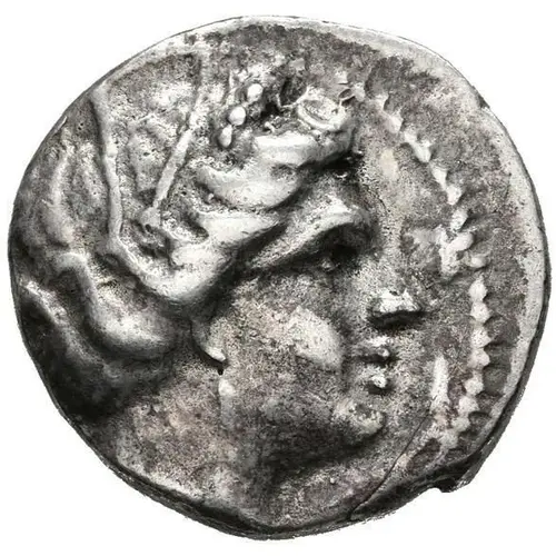 | توضیحات روی سکه | Female head (based on Persephone-Arethusa) right, wearing wreath of wheat; two dolphins to the right, one dolphin to the left. |