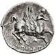 | توضیحات پشت سکه | Pegasus flying right, head formed by a capped figure, squatting and extending his hands towards his feet; dolphin below. |