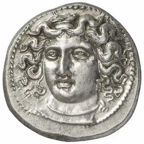 | 正面描述 | Head of the nymph Larissa facing, turned slightly to left, wearing ampyx, triple-pendant earring and necklace |