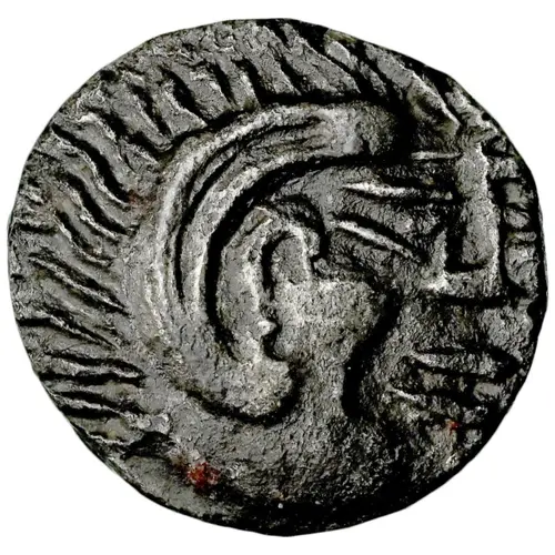| Descripción del anverso | Stylized head of Herakles to right, wearing lion skin headdress. |