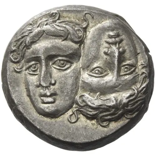 | توضیحات پشت سکه | Sea eagle standing left on dolphin; below, Γ. |