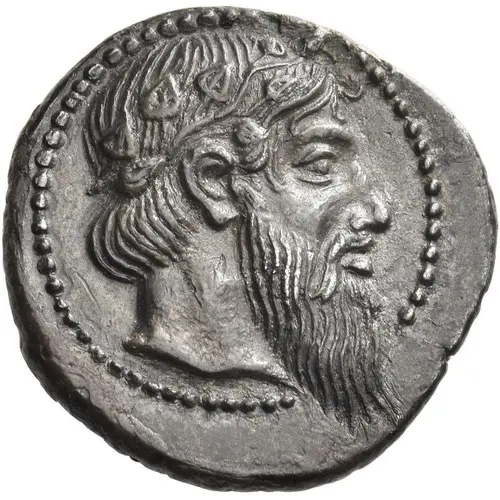 | توضیحات روی سکه | Head of Dionysos to right, wearing ivy wreath and with his hair in a bun at the back |