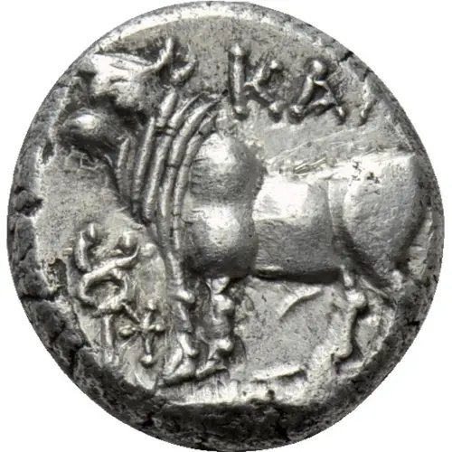 | Descrição do anverso | Bull standing left on grain ear right; kerykeion and star to left |