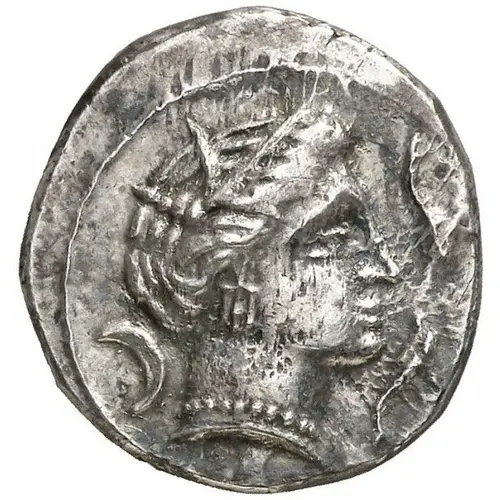 | توضیحات روی سکه | Female head, crowned with ears of wheat, two dolphins to right and crescent at left. |