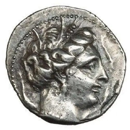 | توضیحات روی سکه | Female head (based on Persephone-Arethusa) facing right, wearing wheat wreath and pearl necklace, with hair ending in four hooked curls. Two dolphins to the right. Dolphin to the left. |