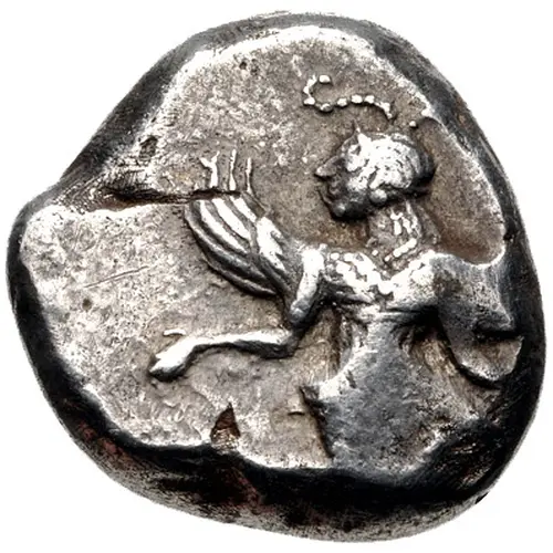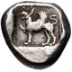 توضیحات پشت سکه Griffin standing facing left, with right forepaw raised, with quadripartite incuse square
