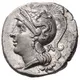 | Aversbeschreibung | Head of Athena to left, wearing crested Attic helmet with Skylla on the bowl, pendant earring and pearl necklace. Behind neck, monogram of ΑΡ |