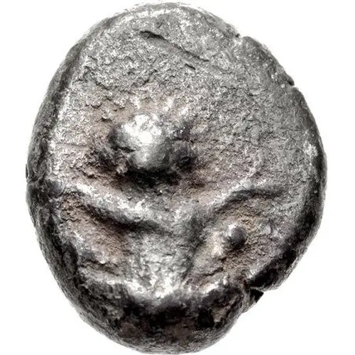 | Opis rewersu | Dolphin diagonally right; silphion fruit above; all within incuse square. |