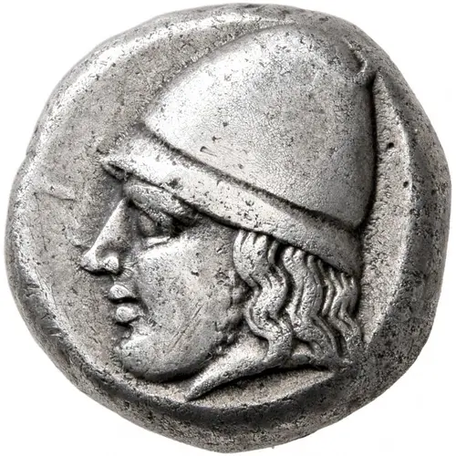 | توضیحات روی سکه | Head of a young Kabeiros to left, wearing conical pileus cap. |