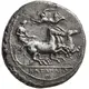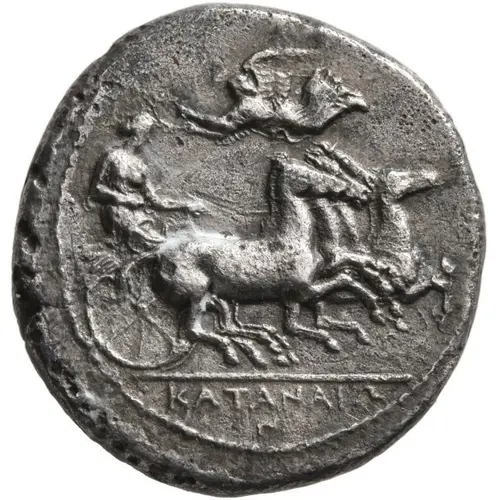 | Obverse description | Charioteer driving quadriga galloping to right, holding kentron in his right hand and reins in his left; above, Nike flying left, crowning the charioteer with a wreath. |