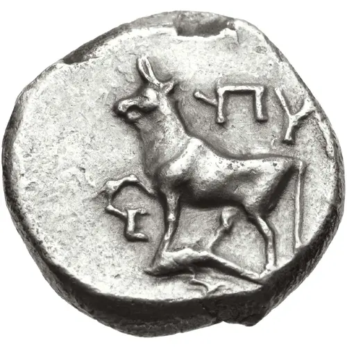 | Obverse description | Bull standing left on dolphin left; monogram to lower left |