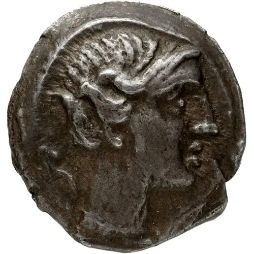 | توضیحات روی سکه | Female head (based on Persephone-Arethusa) right, wearing wreath of wheat; two dolphins to the right, one dolphin to the left. |