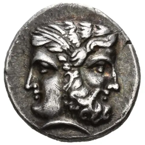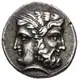توضیحات روی سکه Janiform head of female head left with diadem and bearded male head right.