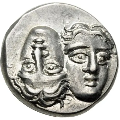 | Opis awersu | Two facing male heads, shown tête-bêche with the left head inverted. |