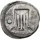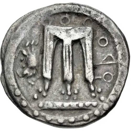| Popis rubu | Incuse tripod as obverse, but wreaths in relief and no serpents; kithara/lyre to left. |