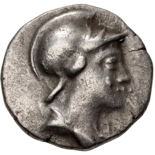 توضیحات روی سکه Male head right, wearing crested helmet.