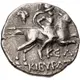 توضیحات پشت سکه Helmeted and cuirassed horseman holding spear and shield, charging right; behind grape.
