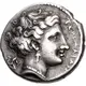 Head of the nymph Terina to right, wearing triple-pendant earring and necklace; behind, triskeles. |