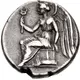 Nike seated left on cippus, wearing chiton and himation, holding caduceus on her outstretched right hand and placing her left on cippus. |