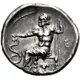 | توضیحات پشت سکه | Bearded Asklepios seated on a stool facing left, holding a long scepter in his left hand and extending his right over the head of a serpent that coils towards the left before him. Under the throne, a hound lying facing right and below the seat, the letters ΘΕ |